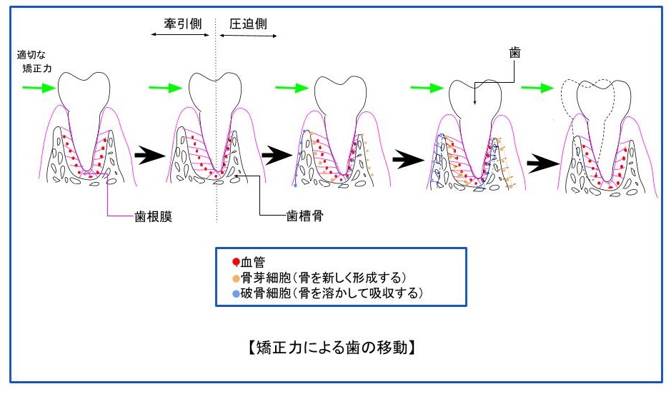 このような「圧迫側」と「牽引側」の2つの状態が発生すると、歯槽骨の改造が行われると共に、歯が移動します。